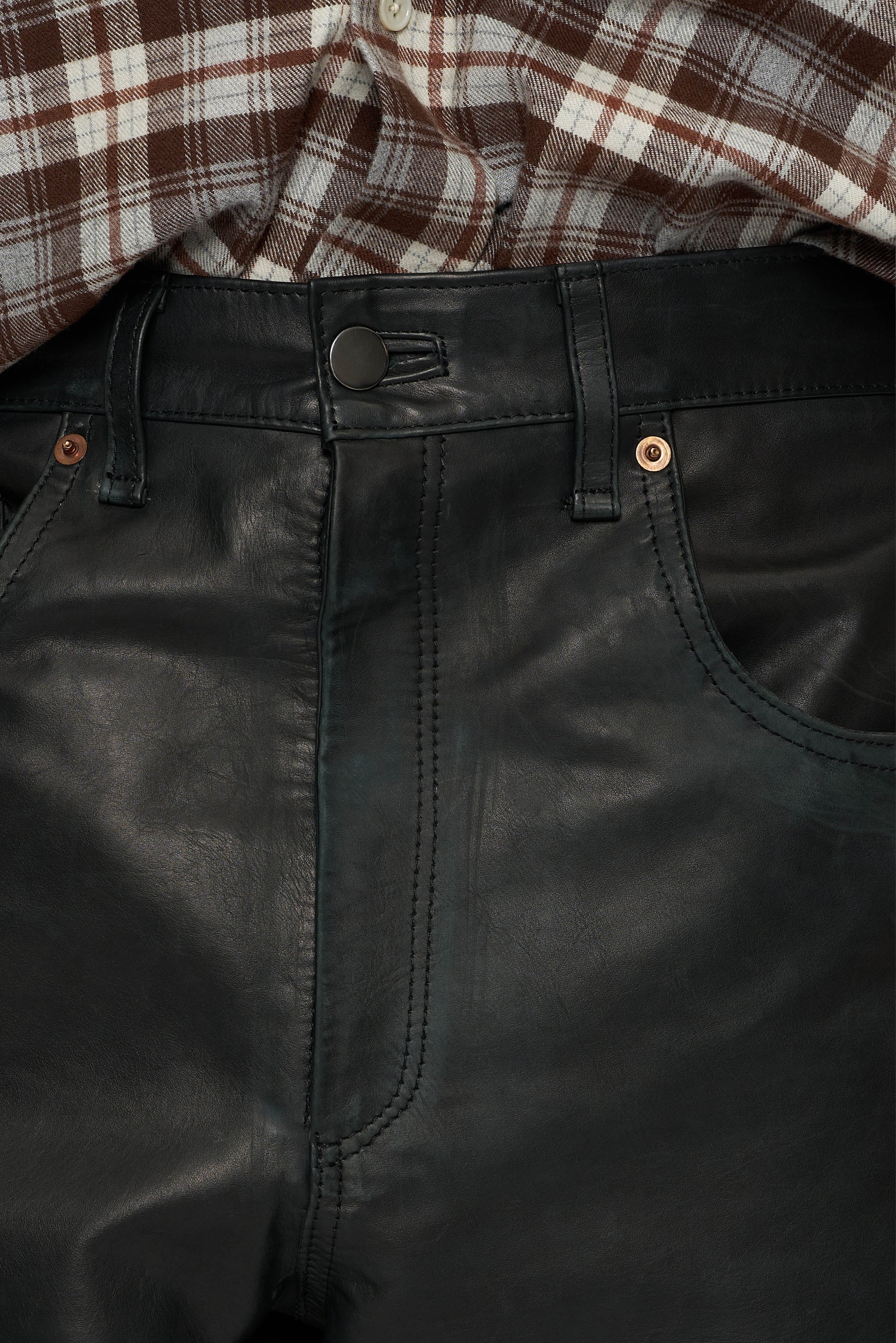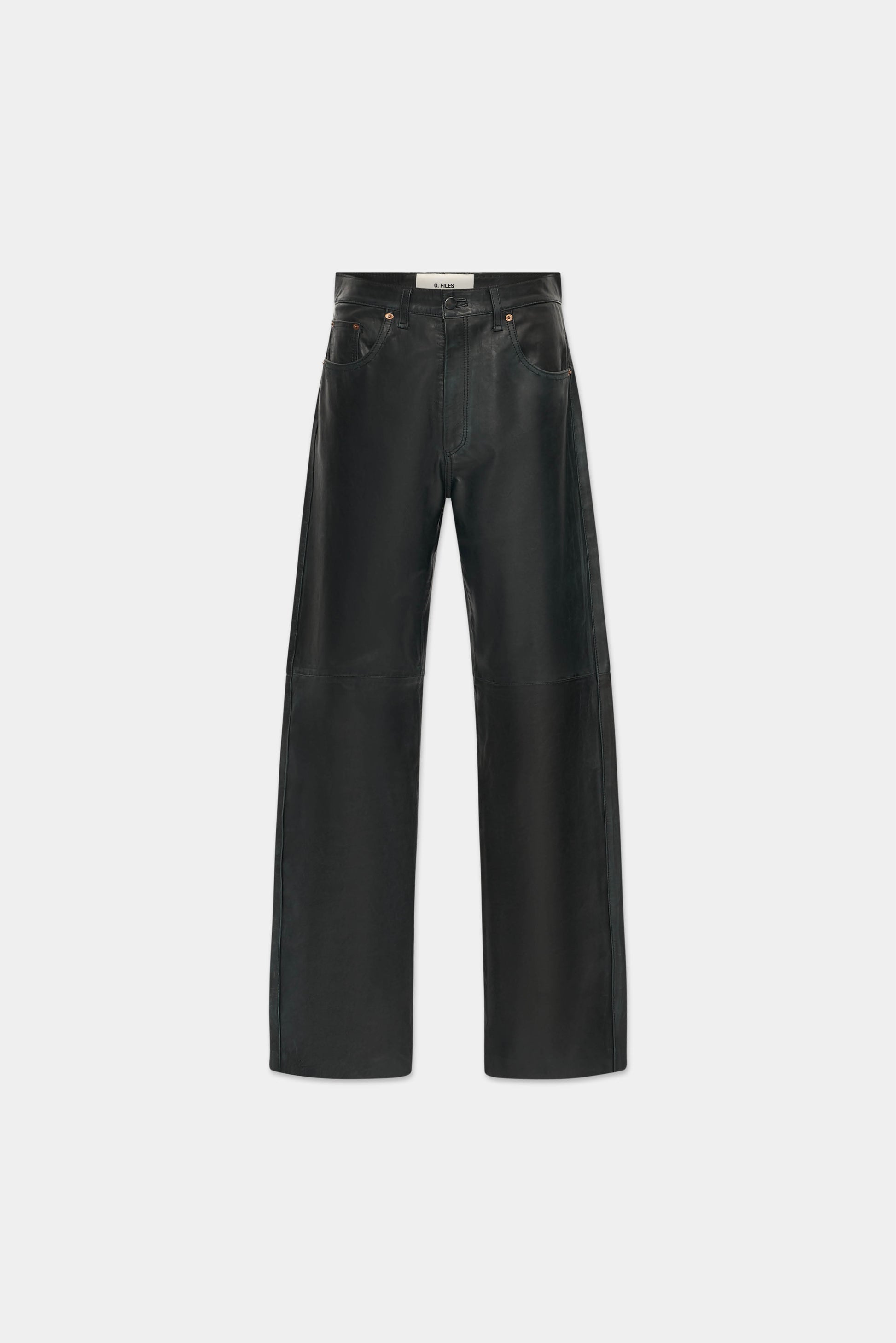 Developed to replicate the construction and aged character of 1970s denim jeans, translated into black leather. Aged and distressed leather is engineered to mimic natural denim wear over time. Crafted from aged calfskin nappa leather in Italy with a worn-in surface and a half-lined interior.